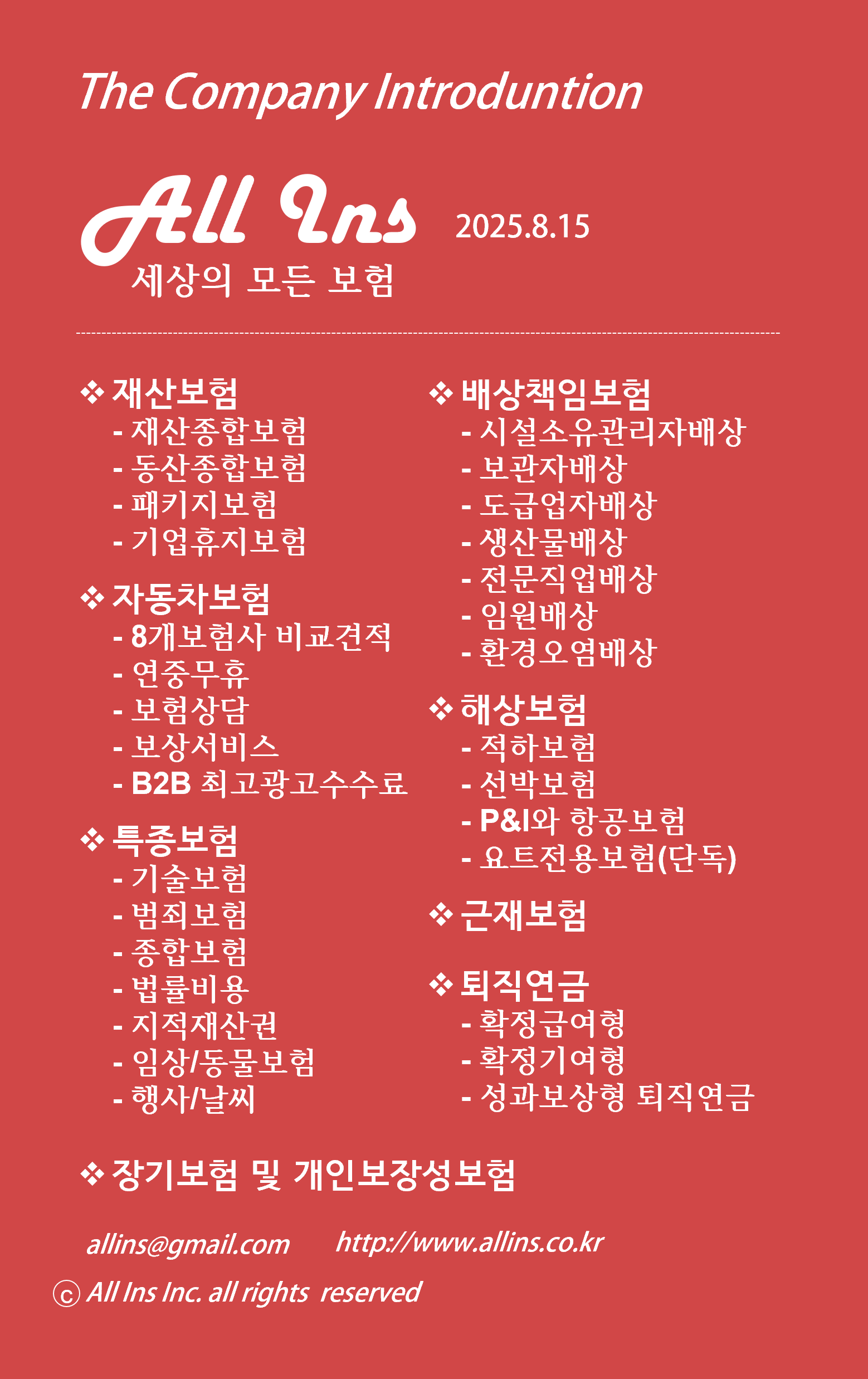 신뢰를 바탕으로 고객의 꿈을 지키는 '세상의 모든 보험' 올인스 All Ins Inc. Create Amazing Your Life 2025 스타트업 및 전통기업에 이르기 까지 모든 기업과 그 구성원의 미래에 대한 리스크를 (주)올인스가 컨설팅합니다.오랜 경험과 신뢰를 바탕으로 변화하는 기업환경에 최적의 기업 리스크 관리 솔루션을 제공하여 드립니다.“Beyond the Your Dream” 올인스와 상담연결 무엇을 도와드릴까요? 기업의 최적화된 보험서비스를 원하십니까?개인의 사생활을 존중받으며 라이프 스타일에 맞는 위험보장을 원하십니까?노후생활에 필요한 퇴직연금설계가 필요하십니까?나의 자동차보험에 맞는 할인서비스와 부가서비스가 무엇인지 알고싶으십니까?심지어 내가 일하는 곳의 자연재해에 대비하실 수 있는 지혜를 찾으십니까? 올인스와 상담연결 재산종합보험 - 재산종합보험- 동산종합보험- 기업패키지보험- 기업휴지보험 자동차보험 - 8개보험사 비교견적- 연중무휴- 보험상담- 보상서비스- B2B 최고광고수수료 특종보험 - 기술보험- 범죄보험- 종합보험- 법률비용- 지적재산권- 임상/동물보험- 행사/날씨 배상책임보험 - 시설소유관리자배상- 보관자배상- 도급업자배상- 생산물배상- 전문직업배상- 임원배상- 환경오염배상 해상보험 - 적하보험- 선박보험- P&I와 항공보험- 요트전용보험(단독) 근재보험과 퇴직연금보험 - 근로자재해보상배상책임- 확정급여형- 확정기여형- IRP 개인형연금계좌- 성과보상형 퇴직연금 무엇을 서비스 합니까? 세상의 모든 보험에 오신 것을 환영합니다. 더 알아보기 올인스의 오랜 고객들! 국내 대기업으로 부터 바로 옆집 이웃에 이르기까지 올인스 구성원의 네트워크는 다이나믹 하며 신뢰를 바탕으로 고객에게 다가섭니다. "놀라운 보험의 발견과 상상 이상의 서비스!" 놀라운 영감과 최선을 다하는 서비스, 투명성을 바탕으로하는 올인스 보험컨설팅이 기업고객과 개인고객의 꿈을 넘어서 더 나은 미래를 바라보며 함께 가겠습니다. 김 경 범 CEO, Allins Inc. 기업보험 상담 언제든 가능합니다. 무엇이 궁금하신가요? 재산종합보험특종보험배상책임보험(중대재해배상)해상보험(요트종합보험)근재보험퇴직연금보험 여기를 클릭하십시요